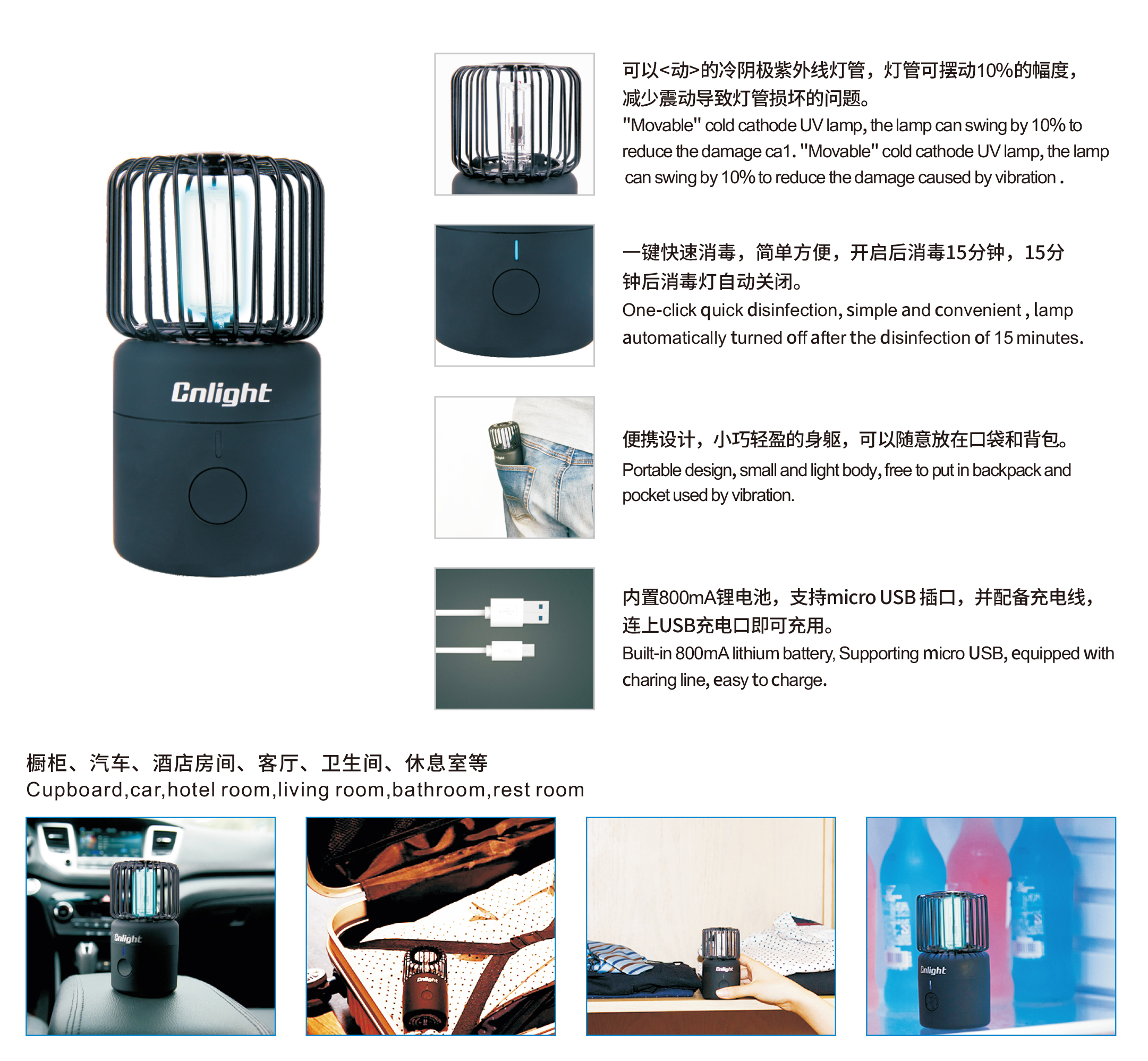 便携设计,一键快速消毒,简单方便,可以<动>的冷阴极紫外线灯管,灯管可摆动10%的幅度,减少震动导致灯管损坏的问题。