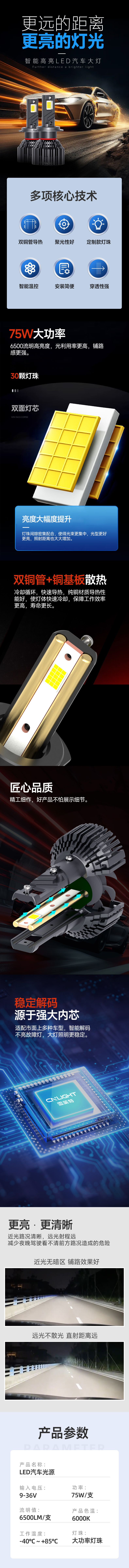 75W大功率 6500流明高亮度,双铜管设计,穿透性好,光利用率高,多项核心科技,铺路感更强。