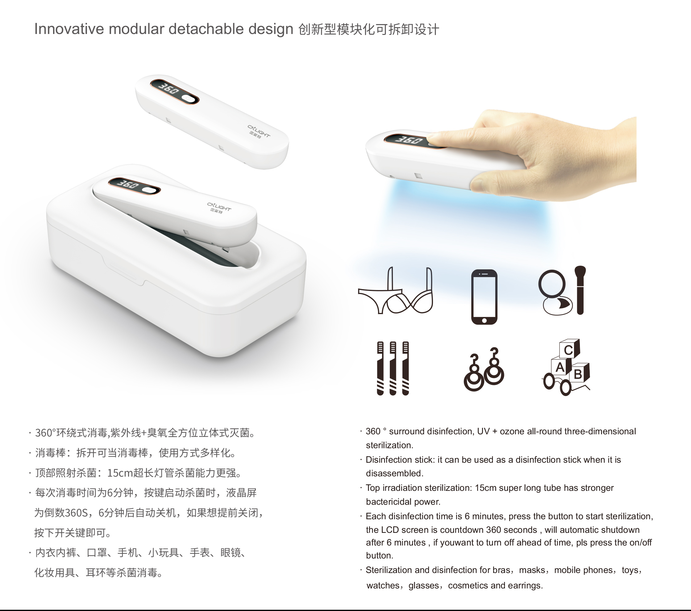 360°环绕式消毒,紫外线+臭氧全方位立体式灭菌,消毒棒:拆开可当消毒棒,使用方式多样化。